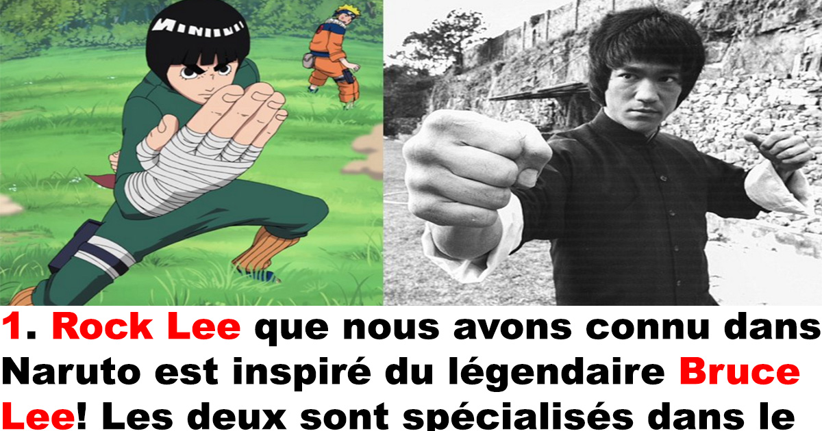 1. Rock Lee que nous avons connu dans Naruto est inspiré du légendaire Bruce Lee! Les deux sont spécialisés dans le Jeet Kun Do,  ils ont le même nom de famille et la même coupe de cheveux. En plus d’avoir la même date d’anniversaire qui est le 27 novembre.