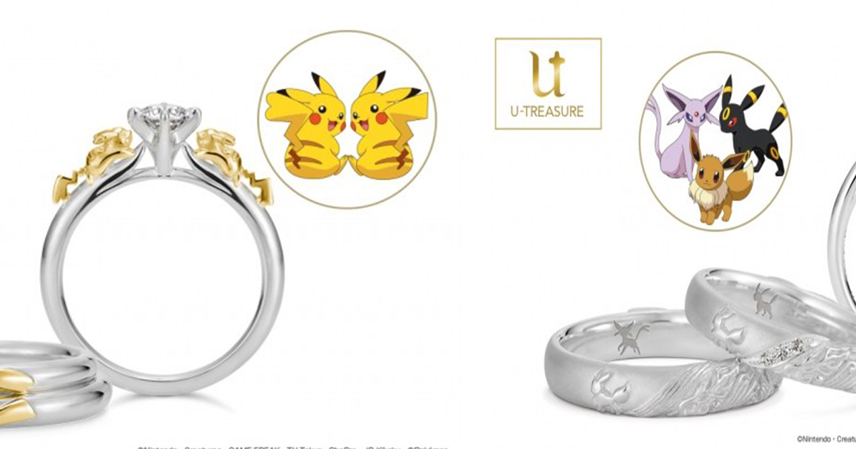 La compagnie de bijoux U-treasure vient de dévoiler sa nouvelle collection d’alliances Pokémon. On peut y retrouver Pikachu, le légendaire duo Espeon / Umbreon ou encore même une incrustation d’une Master Ball et d’un Mew. Ces bagues sont disponibles en or blanc, jaune ou rose et coutent en moyenne 80 000 yens (environ 900$):