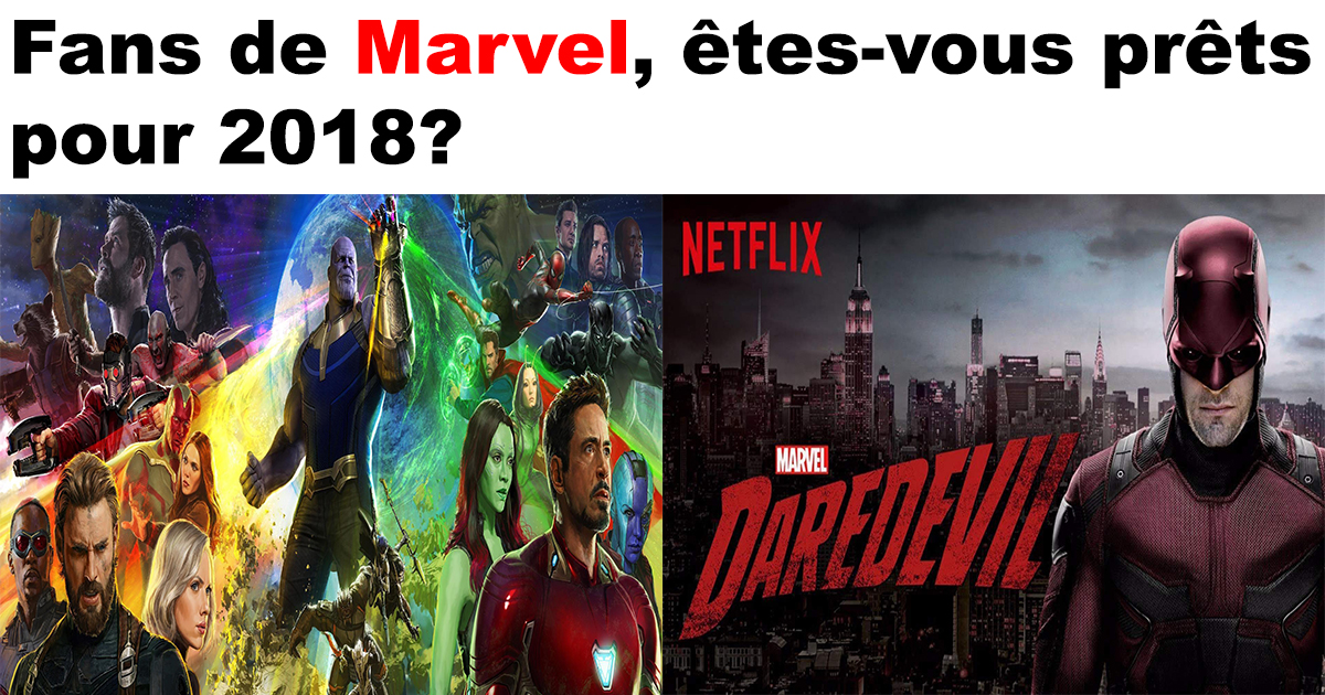 Tous les films et séries-télé Marvel qui vont sortir en 2018 1 janvier 2018 Facebook Article Précédent Article Suivant 1. Runaways-La saison est déjà commencée, mais il reste encore 2 épisodes à sortir pour 20182. Agents of S.H.I.E.L.D. Saison 5-La saison 5 est déjà commencée, mais il reste encore plusieurs épisodes à sortir pour 2018 3. Black Panther-16 février 20184. Cloak and Dagger-20185. Jessica Jones saison 2 -8 mars 20186. Avengers: Infinity War-4 mai 20187. Ant-Man and the Wasp-6 juillet8. Luke Cage Saison 2-20189. Daredevil saison 3-2018 Facebook Article Précédent Article Suivant