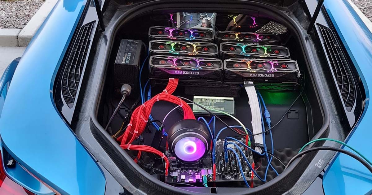 Alors que les cartes graphiques sont présentement en rupture de stock, Simon Byrne, un adepte de la crypto-monnaie a construit une plateforme contenant 6 Nvidia RTX 3080 dans sa BMW i8 hybride.