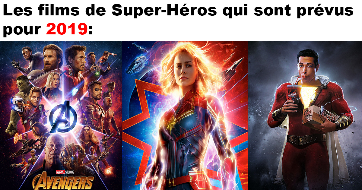 La liste de tous les films de Super-Héros qui sortiront en 2019 (classés par date de sortie) 30 décembre 2018 Facebook Article Précédent Article Suivant Glass-18 janvier 2019Captain Marvel-8 mars 2019 Shazam!-5 avril 2019Hellboy-12 avril 2019Avengers: Endgame-26 avril 2019X-MEN: Dark Phoenix-7 juinSpider-Man: Far From Home-5 juillet 2019The New Mutants-2 août 2019 Joker-4 octobre 2019Spawn-Toujours pas confirmé Facebook Article Précédent Article Suivant