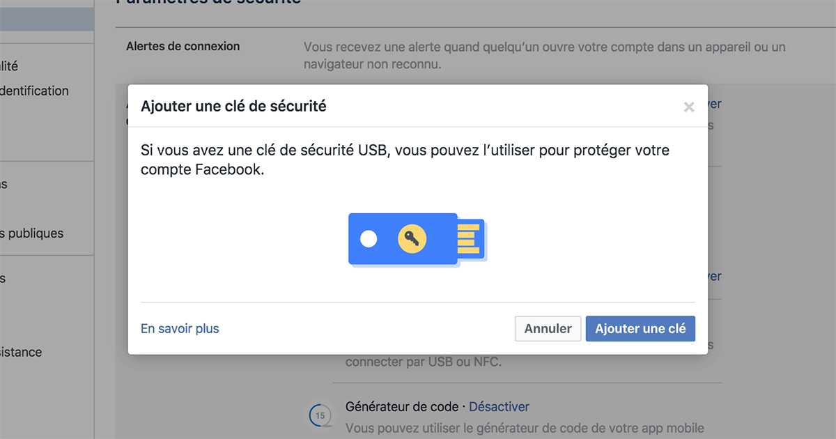 Pour offrir une meilleure sécurité aux utilisateurs, Facebook vient tout juste d’ajouter un nouveau système d’authentification qui nous permet de confirmer notre identité avec une clé USB! Habituellement, quand un utilisateur se connecte sur un nouvel appareil, il reçoit un code de confirmation sur son téléphone qu’il doit ensuite entrer pour des raisons de sécurité.